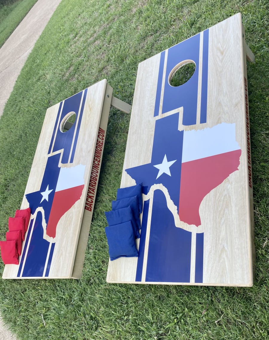 Needing something to keep your guests entertained? Or just wanna show off your skills to your friends? Well these Regulation sized cornhole boards is what you need to make it a fun day. Can pickup or be delivered for a fee. Any concerns or questions Contact Backyard Bounce N More LLC or call/message 936-671-3332.